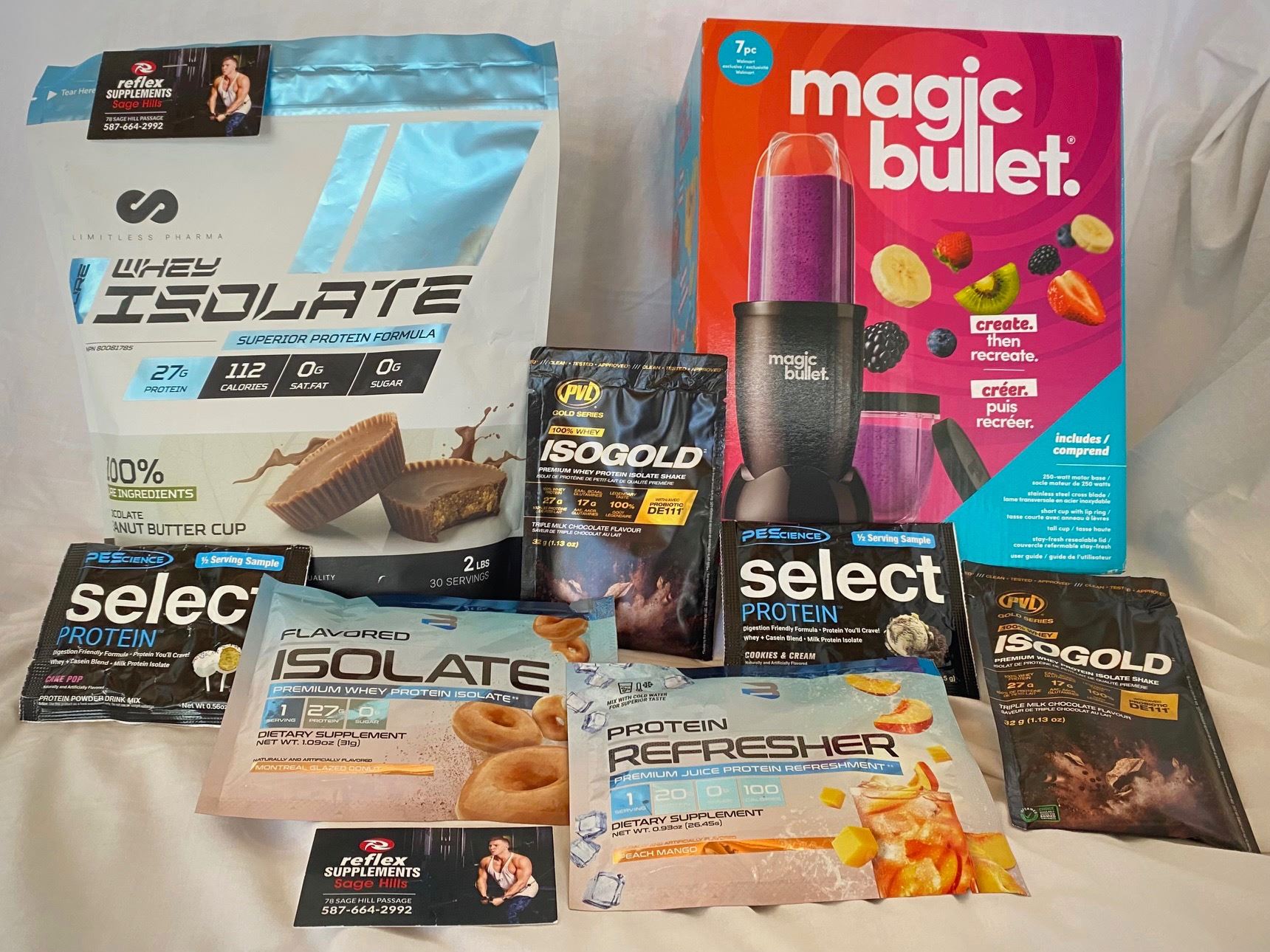 Magic Bullet (7 Piece), 2 Pounds (30 servings) Protein Powder Chocolate Peanut Butter Cup, 6 Protein Samples, 20% off coupon at Reflex Sage Hill.